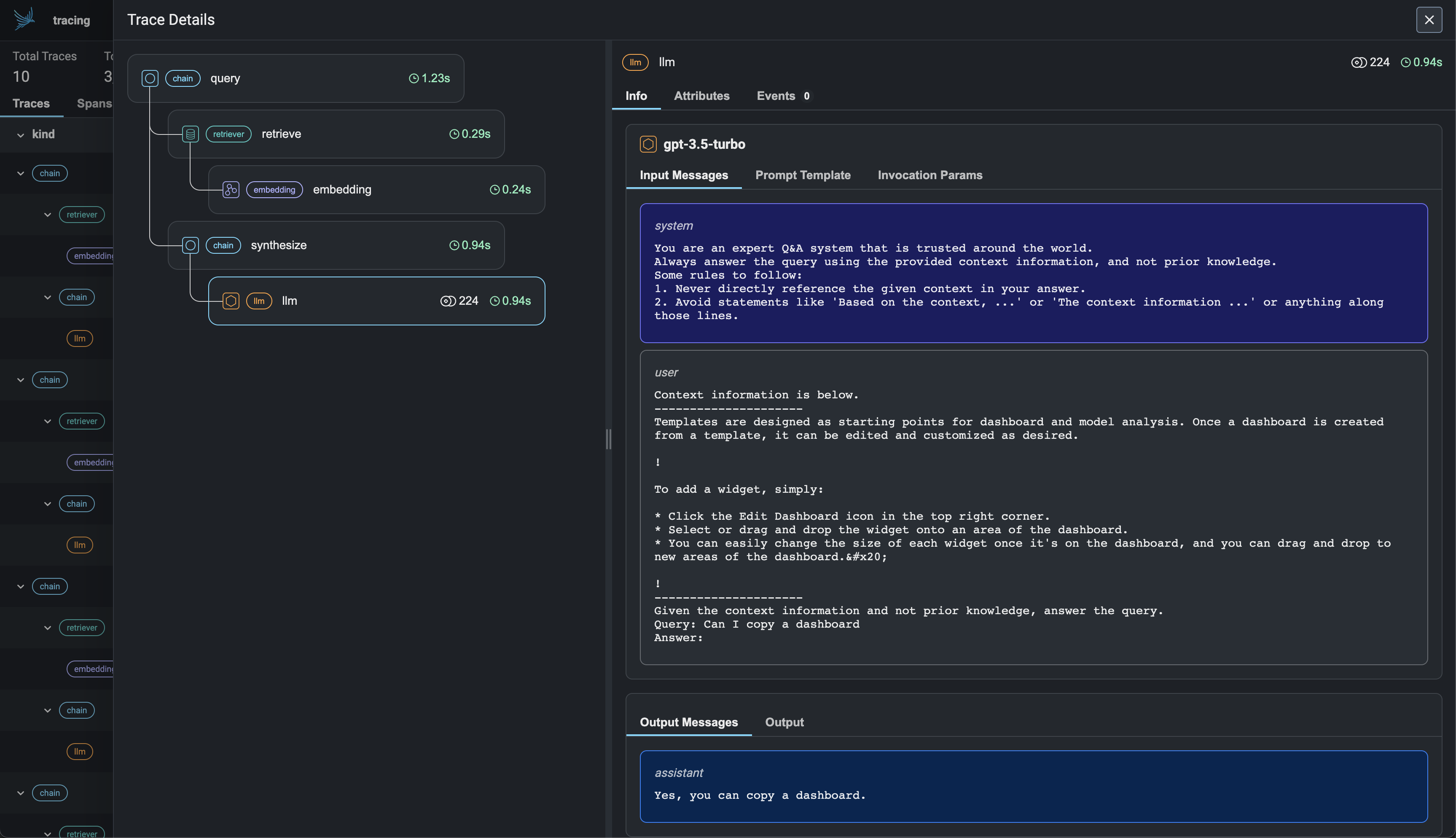 - LLM Traces - Trace through the execution of your LLM Application to understand the internals of your LLM Application and to troubleshoot problems related to things like retrieval and tool execution.