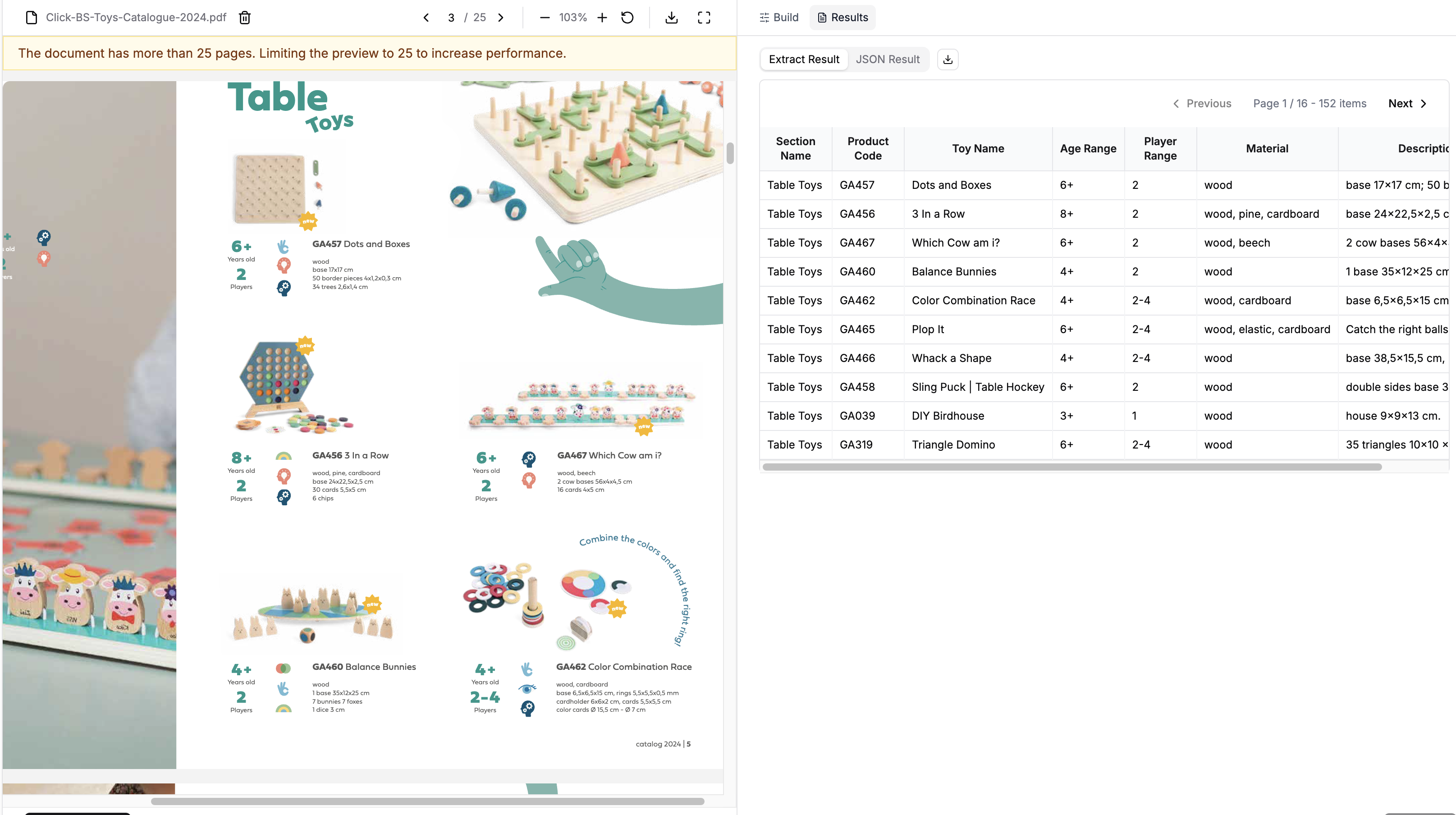 result = await llama_extract.aextract( data_schema=ToyCatalog, files="Click-BS-Toys-Catalogue-2024.pdf", config=ExtractConfig( extraction_mode=ExtractMode.PREMIUM, extraction_target=ExtractTarget.PER_TABLE_ROW, parse_model="anthropic-sonnet-4.5", ),)len(result.data) 153result.data[:10] [{'section_name': 'Table Toys', 'product_code': 'GA457', 'toy_name': 'Dots and Boxes', 'age_range': '6+', 'player_range': '2', 'material': 'wood', 'description': 'base 17x17 cm\n50 border pieces 4x1,2x0,3 cm\n34 trees 2,6x1,4 cm'}, {'section_name': 'Table Toys', 'product_code': 'GA456', 'toy_name': '3 In a Row', 'age_range': '8+', 'player_range': '2', 'material': 'wood, pine, cardboard', 'description': 'base 24x22,5x2,5 cm\n30 cards 5,5x5 cm\n6 chips'}, {'section_name': 'Table Toys', 'product_code': 'GA467', 'toy_name': 'Which Cow am i?', 'age_range': '6+', 'player_range': '2', 'material': 'wood, beech', 'description': '2 cow bases 56x4x4,5 cm\n16 cards 4x5 cm'}, {'section_name': 'Table Toys', 'product_code': 'GA460', 'toy_name': 'Balance Bunnies', 'age_range': '4+', 'player_range': '2', 'material': 'wood', 'description': '1 base 35x12x25 cm\n7 bunnies 7 foxes\n1 dice 3 cm'}, {'section_name': 'Table Toys', 'product_code': 'GA462', 'toy_name': 'Color Combination Race', 'age_range': '4+', 'player_range': '2-4', 'material': 'wood, cardboard', 'description': 'base 6,5x6,5x15 cm, rings 5,5x5,5x0,5 mm\ncardholder 6x6x2 cm, cards 5,5x5,5 cm\ncolor cards Ø 15,5 cm - Ø 7 cm'}, {'section_name': 'Table Toys', 'product_code': 'GA465', 'toy_name': 'Plop It', 'age_range': '6+', 'player_range': '2-4', 'material': 'wood, elastic, cardboard', 'description': 'Catch the right balls and plop them in the net!\n* 2 ploppers 8x5 cm\n* 2 net holders Ø 5cm, length 55 cm\n* 6 cards 1,5x2,5 cm, 30 balls Ø 2,5 cm\n* 1 rope 120 cm'}, {'section_name': 'Table Toys', 'product_code': 'GA466', 'toy_name': 'Whack a Shape', 'age_range': '4+', 'player_range': '2-4', 'material': 'wood', 'description': '* base 38,5x15,5 cm\n* 2 stands 36 half balls, 4 hammers\n* 1 dice 2,5 cm\n* 4 cards'}, {'section_name': 'Table Toys', 'product_code': 'GA458', 'toy_name': 'Sling Puck | Table Hockey', 'age_range': '6+', 'player_range': '2', 'material': 'wood', 'description': '* double sides base 39x21x3 cm\n* 10 chips Ø 2,5 cm\n* 2 pushers 4x4x3 cm'}, {'section_name': 'Table Toys', 'product_code': 'GA039', 'toy_name': 'DIY Birdhouse', 'age_range': '3+', 'player_range': '1', 'material': 'wood', 'description': '* house 9x9x13 cm'}, {'section_name': 'Table Toys', 'product_code': 'GA319', 'toy_name': 'Triangle Domino', 'age_range': '6+', 'player_range': '2-4', 'material': 'wood', 'description': '* 35 triangles 10x10 x10 cm'}]